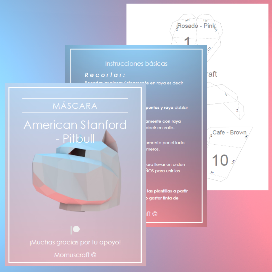 En esta ocacion crearemos la máscara de un perro American Stanford o Pitbull, las plantillas cuentan con 13 páginas las cuales se imprimen en los colores de tu preferencia, es una máscara minimalista muy sencilla de armar.
