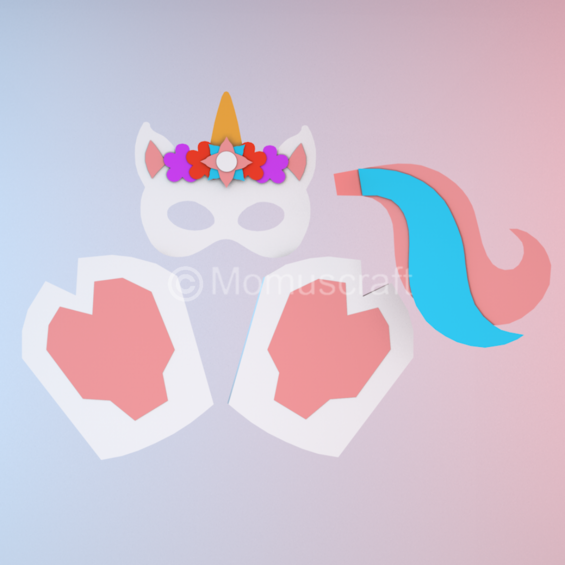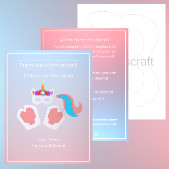 Estas plantillas descargables cuentan con 9 páginas con piezas las cuales puedes imprimir para realizar tu propio disfraz de unicornio, tienes el video tutorial de como crear este diseño en nuestro canal de YouTube Momuscraft.