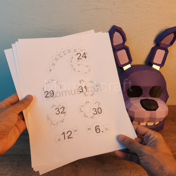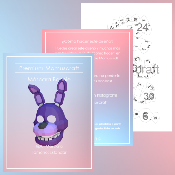 Estas plantillas descargables cuentan con 8 páginas con piezas las cuales puedes imprimir para realizar tu propia máscara de bonnie, importante ver el video tutorial de como crear este diseño en nuestro canal de YouTube Momuscraft