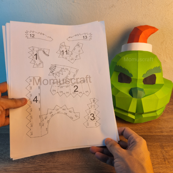 Estas plantillas descargables cuentan con 6 páginas con piezas las cuales puedes imprimir para realizar tu propia máscara de El Grinch, importante ver el video tutorial de como crear este diseño en nuestro canal de YouTube Momuscraft