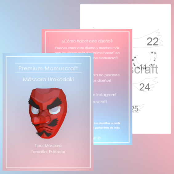 Estas plantillas descargables cuentan con 5 páginas con piezas las cuales puedes imprimir para realizar tu propia máscara roja del señor Urokodaki, importante ver el video tutorial de como crear este diseño en nuestro canal de YouTube Momuscraft