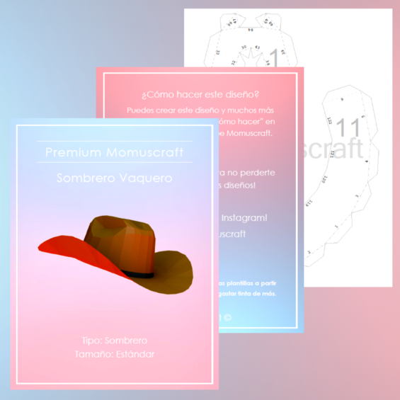 Estas plantillas descargables cuentan con 13 paginas con piezas las cuales puedes imprimir para realizar tu propio sombrero vaquero, tienes el video tutorial de como crear este diseño en nuestro canal de YouTube Momuscraft